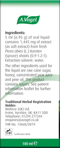 5ml (6.95g) of the cough syrup contains 1.445g of extract (as soft extract) from fresh Picea abies (L.) Karsten (spruce) shoots (0.9-1.2:1.) Extraction solvent: water. The other ingredients used for the cough syrup are raw cane sugar, honey, concentrated pear juice and pine oil.