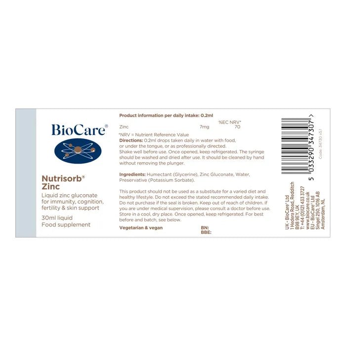 When your body needs easily absorbed zinc for immunity, skin health, and cellular protection, this liquid formula delivers. BioCare Nutrisorb Zinc 30ml provides 7mg of zinc gluconate per daily intake in a clean glycerine base, ideal for teens and adults aged 12+. It supports immune resilience, fertility, cognitive function, and antioxidant defence - with no artificial additives and flexible dosing.