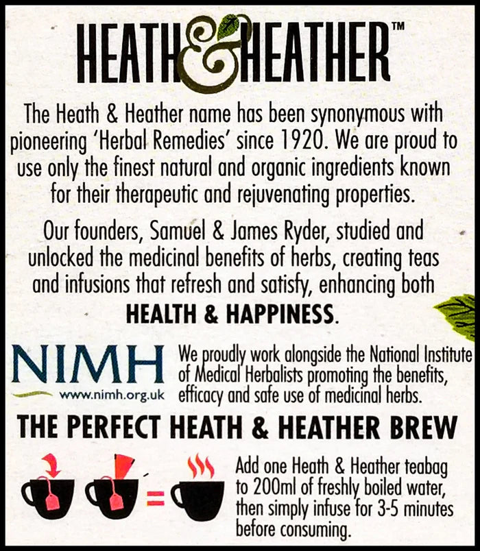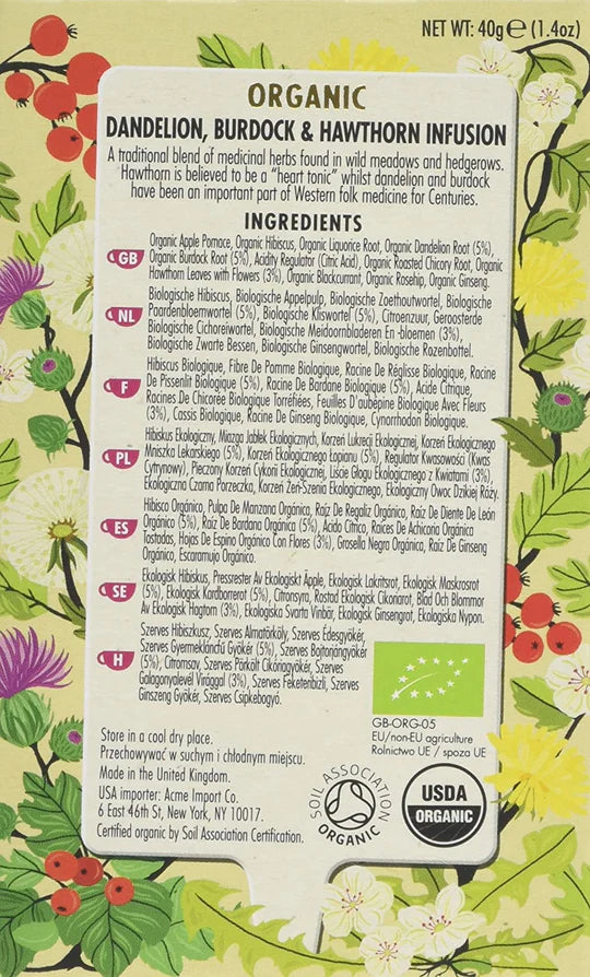 Earthy Herbal Infusion with Dandelion, Burdock & Hawthorn! Heath & Heather Dandelion, Burdock & Hawthorn is a naturally caffeine-free blend inspired by traditional British hedgerow botanicals. With earthy dandelion and burdock roots, floral hawthorn, and a medley of fruits and herbs, this organic infusion supports wellbeing with a rich, grounding flavour.