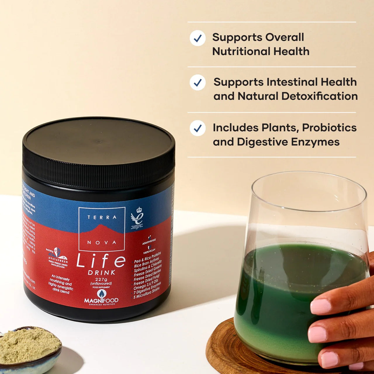 Daily nourishment in one scoop! Terranova Life Drink is a comprehensive daily superfood blend combining plant proteins, freeze-dried greens, berries, mushrooms, microalgae, omega oils, digestive enzymes, probiotics, and prebiotic fibre. Designed to support energy, immunity, digestion, and overall vitality, it’s intensely nourishing, synergistic, and 100% additive-free.