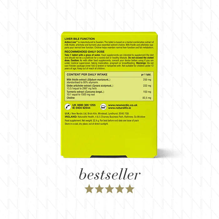 Daily Herbal Liver Support with Milk Thistle, Artichoke & Turmeric! New Nordic Active Liver is a Swedish-formulated supplement that helps protect and support liver function. With a blend of traditional herbs and nutrients, it’s ideal for those seeking gentle detox support, improved digestion, and overall liver wellness.