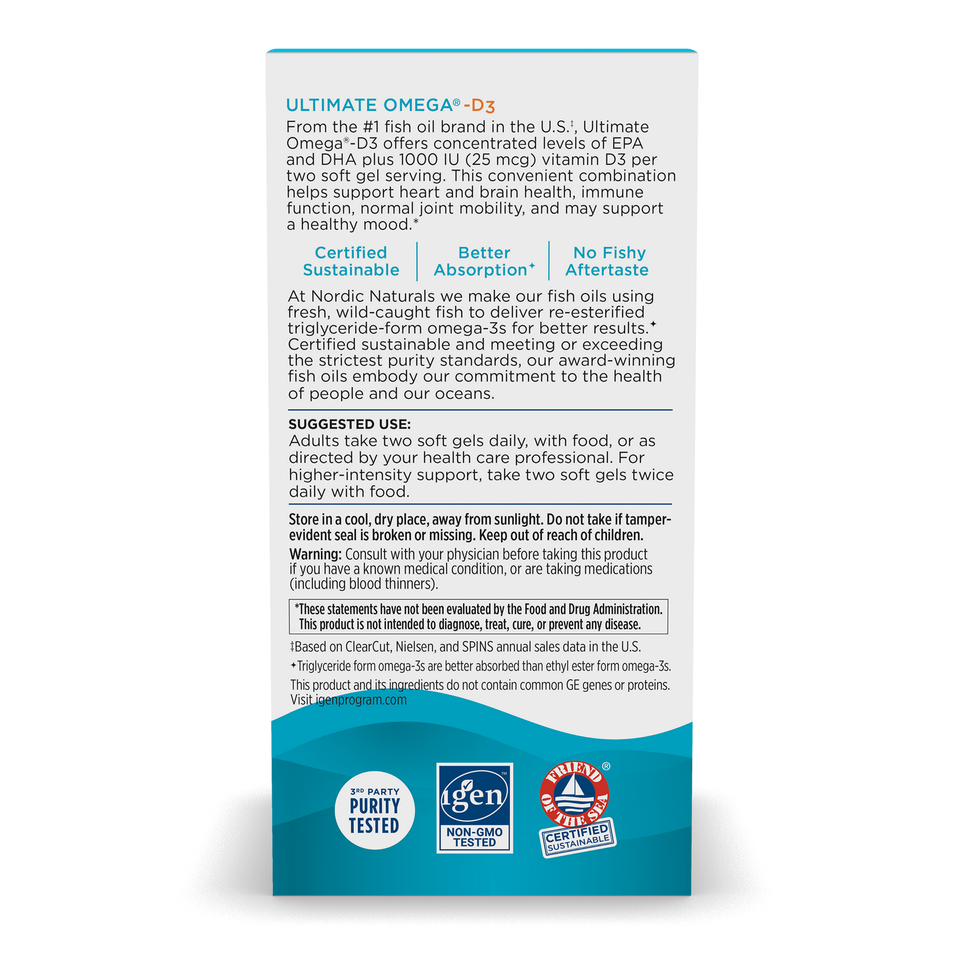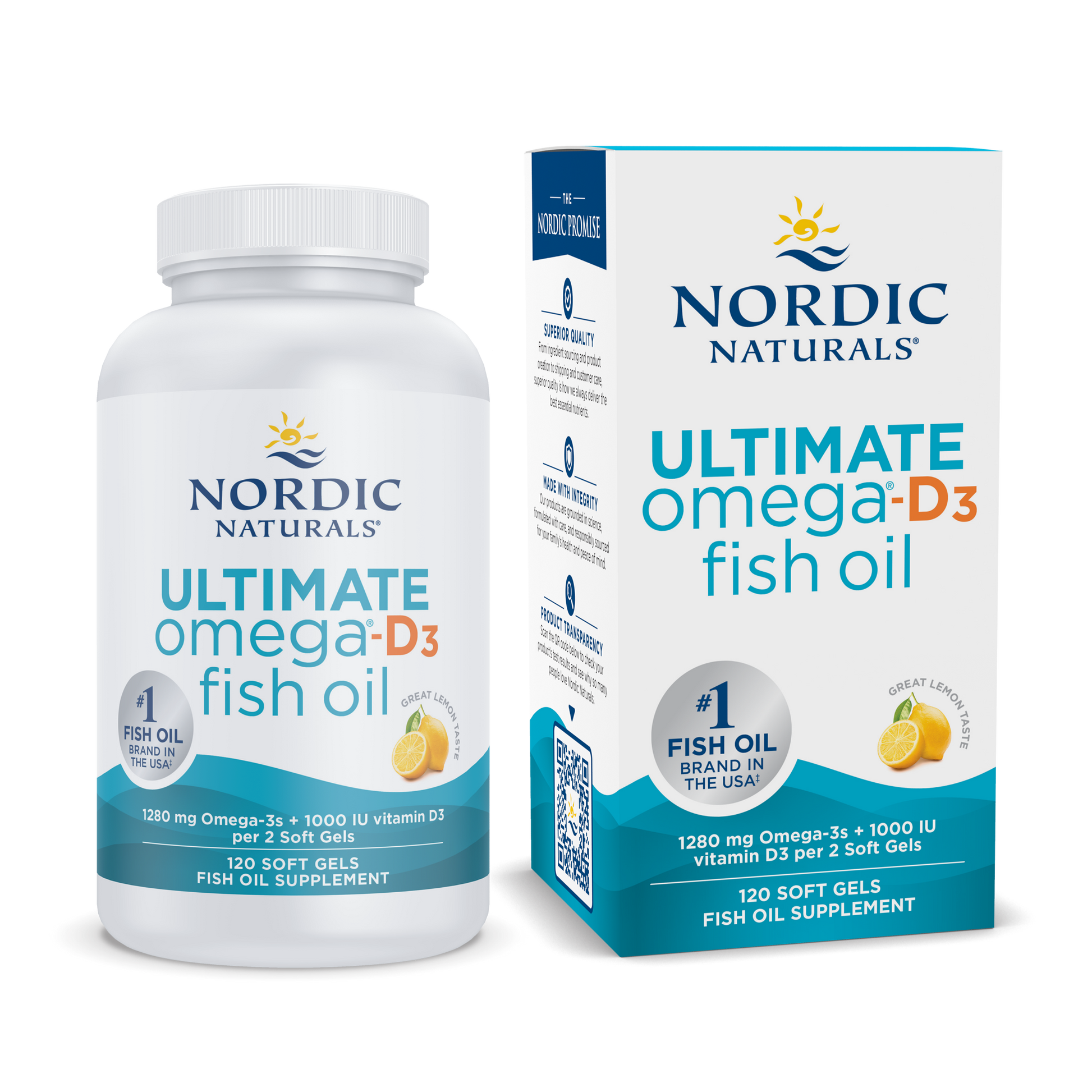 Each serving (2 softgels) provides 1280mg of total omega-3s, including EPA (650mg) and DHA (450mg), plus 1000 IU of vitamin D3 for added bone and immune support.