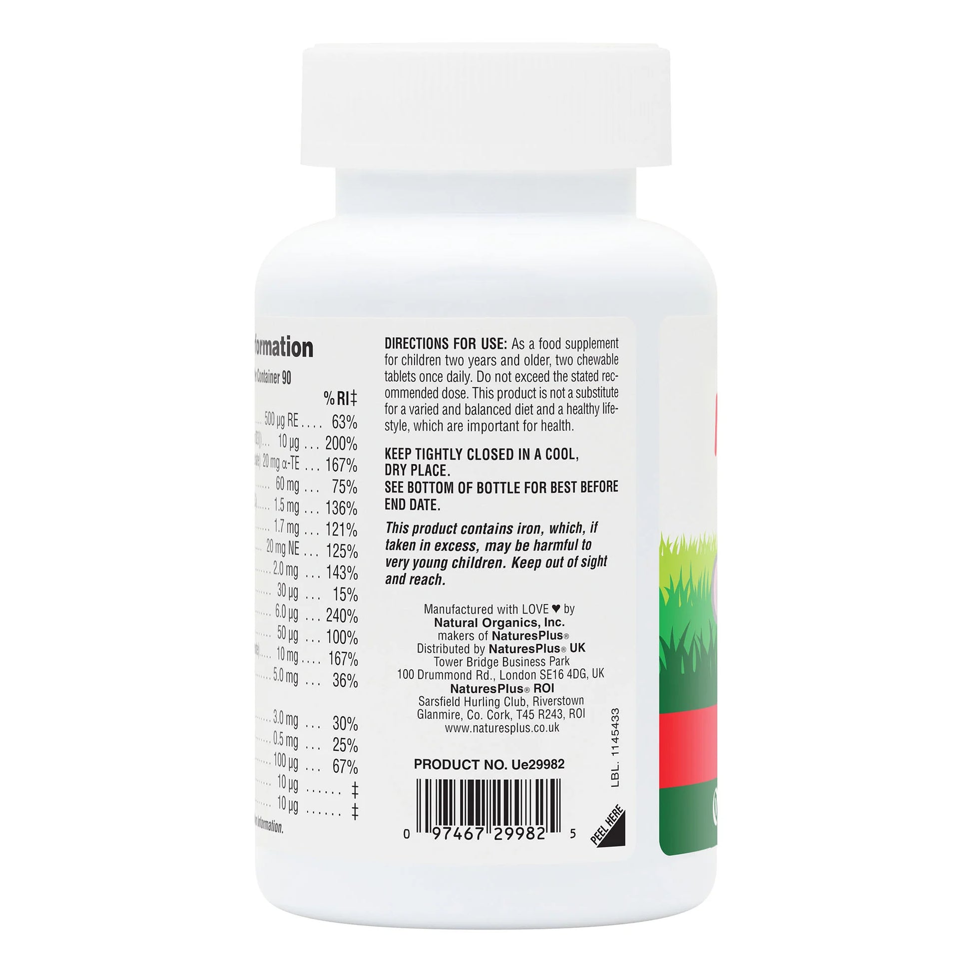 Nutritional Information:(Per typical daily serving) Total Carbohydrate 2 gSugars 2 g Vitamin A as beta carotene 5000 IUVitamin C as ascorbic acid 60 mgVitamin D as ergocalciferol 400 IUVitamin E as d-alpha tocopheryl acetate 30 IUThiamin (B1) as thiamine HCl 1.5 mgRiboflavin (B2) 1.7 mgNiacin (B3) as niacinamide 20 mgVitamin B6 as pyridoxine HCl 2 mgFolate,Folic Acid,Folacin 10 mcgVitamin B12 as cyanocobalamin 6 mcgBiotin 50 mcgPantothenic acid as calcium pantothenate 10 mgCalcium as aminoate complex 20 mgIron as aminoate complex 5 mgIodine from kelp 100 mcgMagnesium as aminoate complex 10 mgZinc as aminoate complex 3 mgCopper as aminoate complex 0.05 mgManganese as aminoate complex 0.05 mgPotassium as aminoate complex 1 mgPineapple Fruit 50 mgApple Fruit 50 mgSunflower Oil 20 mgLemon Bioflavonoid Complex from Citrus limon fruit 20 mgPABA para-aminobenzoic acid 400 mcgCholine as bitartrate 10 mcgInositol 10 mcg.