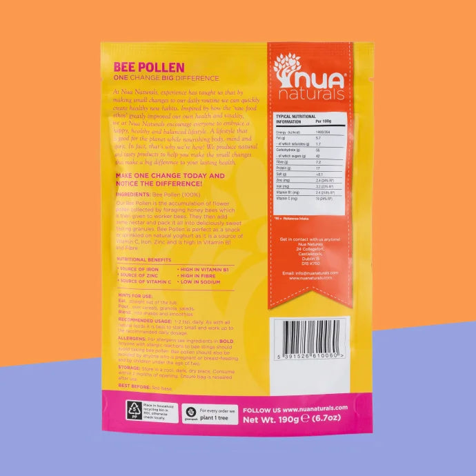 Nature’s Superfood for Energy, Immunity & Vitality! Nua Naturals Bee Pollen Granules are a powerhouse of nutrition, collected by honeybees from flowering plants and packed with vitamins, minerals, amino acids, enzymes, and antioxidants. Especially rich in B vitamins, iron, zinc, and fibre, bee pollen supports energy, immunity, and overall wellbeing. Enjoy it sprinkled on cereal, blended into smoothies, or stirred into yogurt.
