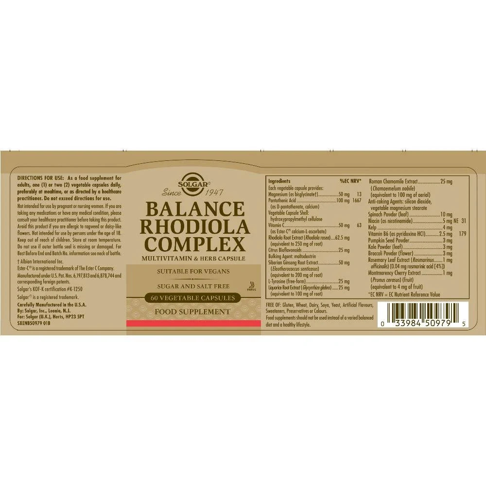 Comprehensive Herbal & Nutrient Complex for Physical and Mental Resilience! Solgar Balance Rhodiola Complex 60 Capsules is a premium adaptogen and B-vitamin formula designed to support your body’s ability to handle stress, maintain mental focus, and sustain energy levels. Ideal for those facing high cognitive demand or low physical stamina.