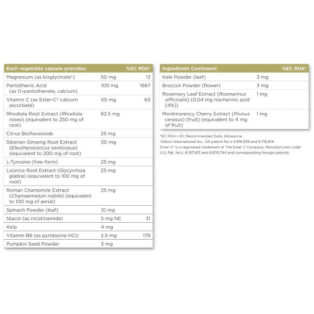 Magnesium (as bisglycinate), Pantothenic Acid (as D-pantothenate, calcium), Vegetable Capsule Shell: hydroxypropylmethyl cellulose, Vitamin C (as Ester-C ® calcium-L-ascorbate), Rhodiola Root Extract (Rhodiola rosea), Citrus Bioflavonoids, Bulking Agent: maltodextrin, Siberian Ginseng Root Extract (Eleutherococcus senticosus), L-Tyrosine (free-form), Liquorice Root Extract (Glycyrrhiza glabra), Roman Chamomile Extract (Chamaemelum nobile), Anti-caking Agents: silicon dioxide, vegetable magnesium stearate, Spinach Powder (leaf), Niacin (as nicotinamide), Kelp, Vitamin B6 (as pyridoxine HCI), Pumpkin Seed Powder, Kale Powder (leaf), Broccoli Powder (flower), Rosemary Leaf Extract (Rosmarinus officinalis) (rosmarinic acid 4%), Montmorency Cherry Extract (Prunus cerasus) (fruit).