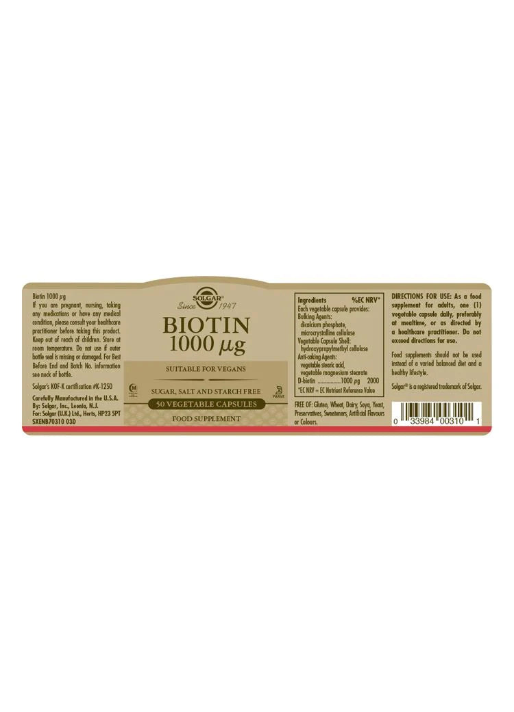Daily Beauty & Metabolism Support in a Gentle, Vegan Formula! Solgar Biotin 1000 ug provides a high-potency dose of biotin (vitamin B7), a water-soluble B-vitamin that supports healthy hair, skin, and nails, as well as energy metabolism and nervous system function. It is a key nutrient for both beauty and vitality.