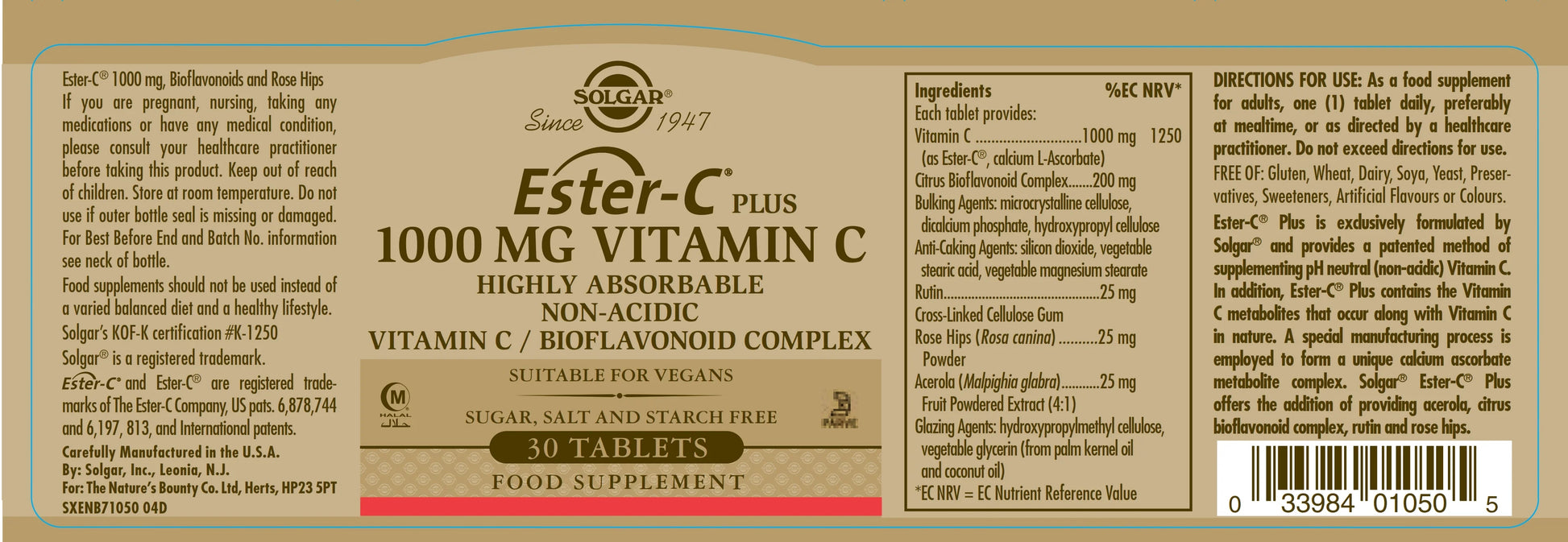 Vitamin C (as Ester-C, calcium L-Ascorbate), Citrus Bioflavonoid Complex, Bulking Agents: (microcrystalline cellulose, dicalcium phosphate, hydroxypropyl cellulose), Anti-Caking Agents: (silicon dioxide, vegetable stearic acid, vegetable magnesium stearate), Rutin, Cross-Linked Cellulose Gum, Rose Hips (Rosa canina) Powder, Acerola (Malpighia glabra) Fruit Powdered Extract (4:1), Glazing Agents: (hydroxypropylmethyl cellulose, vegetable glycerin (from palm kernel oil and coconut oil)).