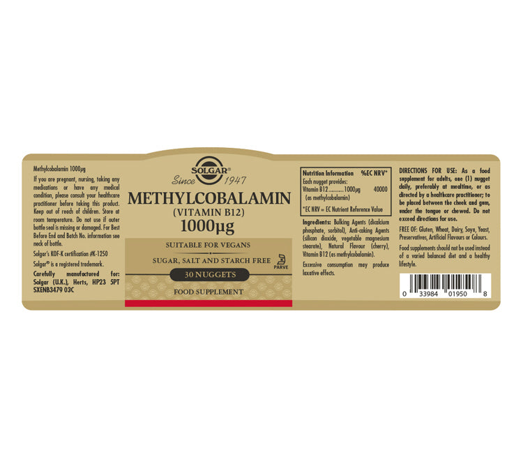 Body-Ready B12 in a Convenient Sublingual Nugget! Solgar Methylcobalamin 30 Nuggets delivers 1000 µg of active vitamin B12 in a fast-dissolving nugget designed for optimal absorption under the tongue. Methylcobalamin is already in the form your body uses, no conversion needed. Ideal for those with restricted diets, low stomach acid, or increased B12 needs, this formula supports energy metabolism, red blood cell formation, and nervous system function.