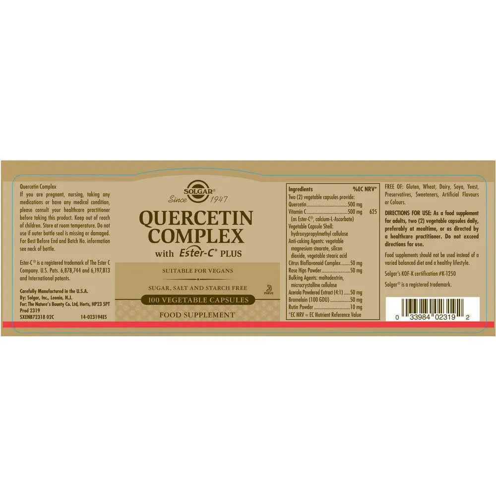 Advanced Antioxidant & Allergy Support with Vitamin C and Bioflavonoids! Solgar Quercetin Complex is a synergistic blend of quercetin, Ester-C, and citrus bioflavonoids formulated to support seasonal immune health, antioxidant protection, and inflammation balance. This complex is ideal for allergy sufferers, those with inflammatory conditions, or anyone seeking robust immune defence.