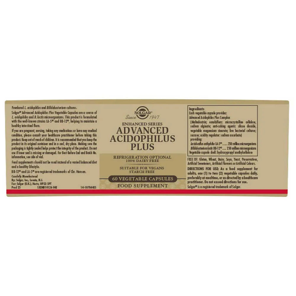 Dual-Strain Probiotic for Digestive & Immune Support! Solgar Advanced Acidophilus Plus delivers a clinically studied blend of Lactobacillus acidophilus (LA-5) and Bifidobacterium lactis (BB-12), two well-researched probiotic strains that naturally reside in the lower digestive tract. These friendly bacteria help maintain intestinal balance, nutrient absorption, and immune resilience, especially after antibiotic use or during periods of digestive stress.