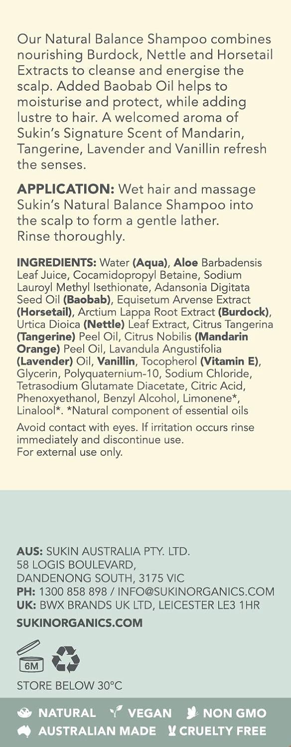 ✔ How to Use - Apply to wet hair, massage into scalp to lather, then rinse thoroughly. Follow with Sukin Natural Balance Conditioner.